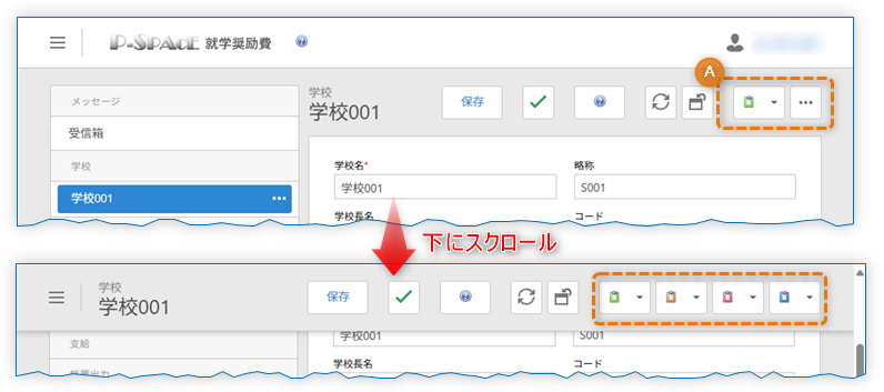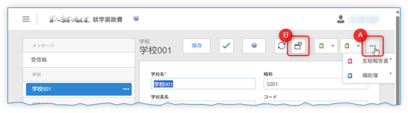 ということですので、やはりウェブブラウザにおいて表示領域が狭いために「支弁区分関連」ボタンが表示されていないような状況(下図A)なのだろうと想像します。帳票出力ボタン、学校→学校名の画面を下にスクロールすると現れました
