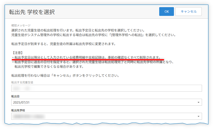 転出処理の際に、転入元学校で入力された『「経費使用日時」が「7月31日」以降となっている、当該児童生徒の経費明細』は削除されます。